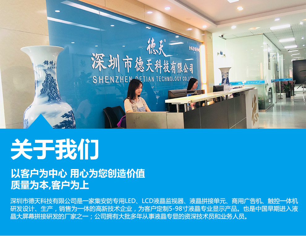 Shenzhen Detian Technology Co., Ltd. focuses on security LEDs, LCD monitors, and LCD splicing screens. The company has ten years of production experience, professional production technology, and a first-class production team. In the wave of intelligent living, we will also adhere to our original intention, focus on quality, keep up with the times, pay attention to product research and development innovation, fully integrate intelligent technology with LCD splicing screen technology, and meet the actual needs of consumers.